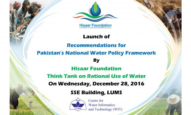 Hisaar Foundation, in collaboration with the Centre for Water Informatics and Technology at LUMS, is pleased to invite you to the launch of the first report of Think Tank on Rational Use of Water. This report includes recommendations for Pakistan’s national water policy framework developed by the members of the Think Tank on Rational Use of Water, a recently established strategic initiative of the Hisaar Foundation. This policy framework is a culmination of the many months of deliberations of the Think Tank members and stakeholder consultations in various cities of Pakistan with representatives of the government, business communities, international agencies, corporate sector, women’s groups, and civil society organisations.